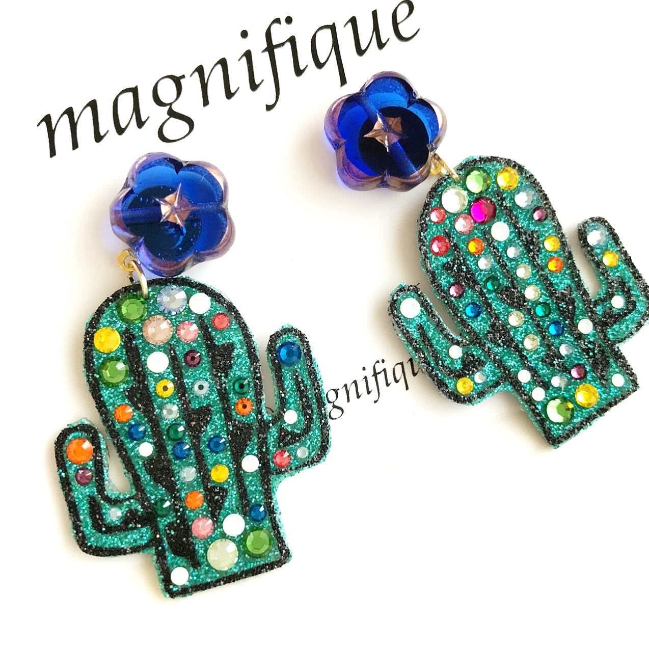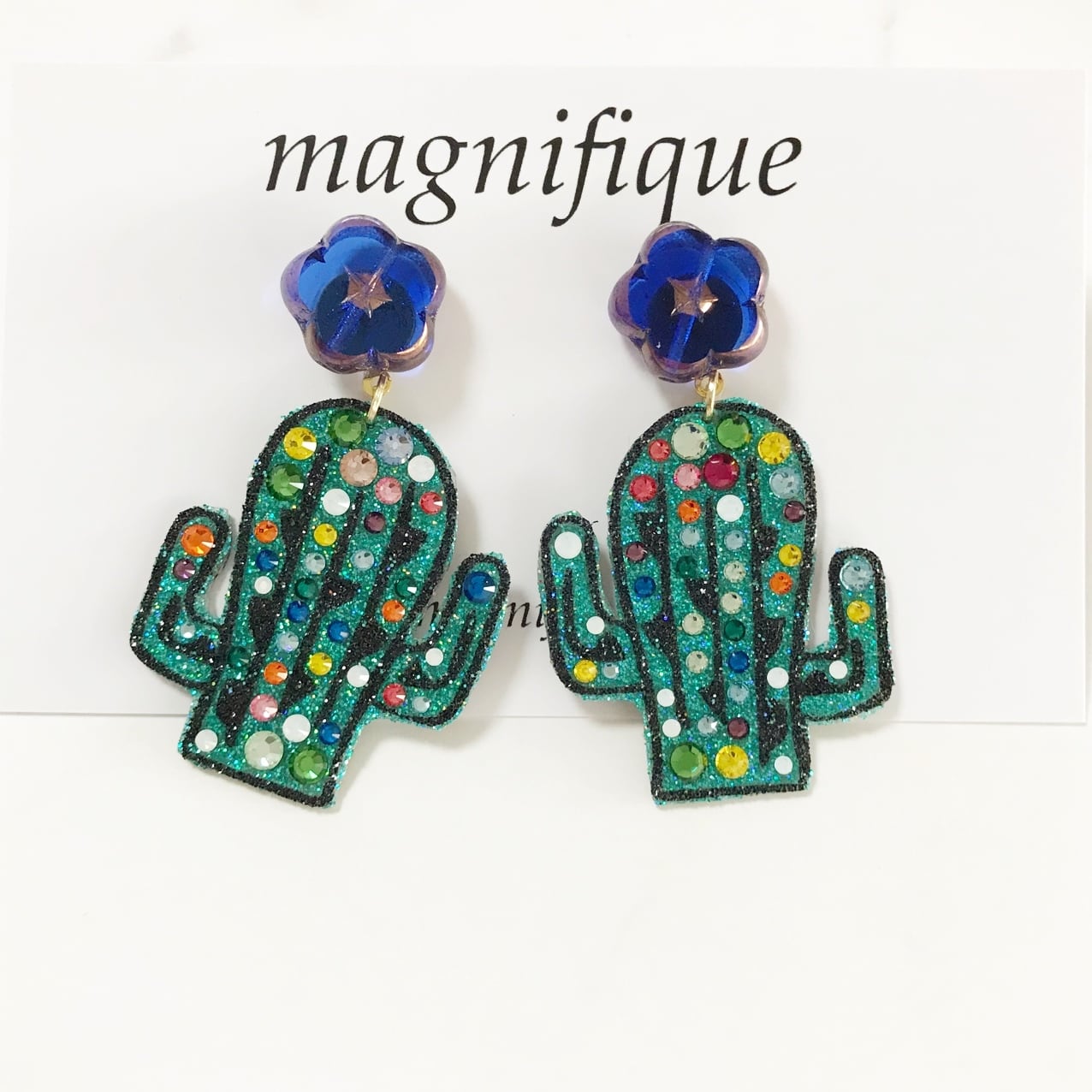 カラフルビジューとチェコビーズのサボテンピアス レザーアクセサリー
